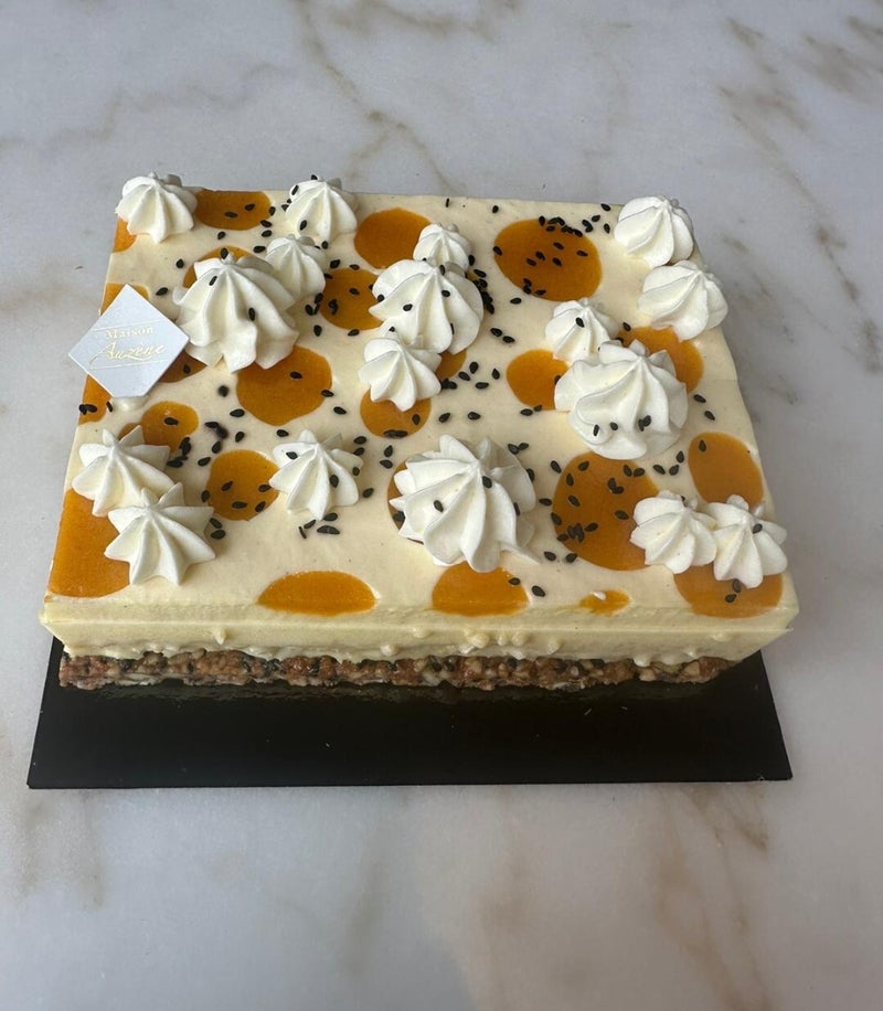 Crémeux Mangue Passion et Mousse Vanille Confit Passion et chantilly vanille sur un Croustillant graines de courges et sésame noir