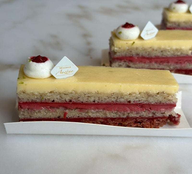 Crémeux fraise -compotée de fraises ganache montée verveine et citron sur un biscuit croustillant citron vert et un biscuit roulade
